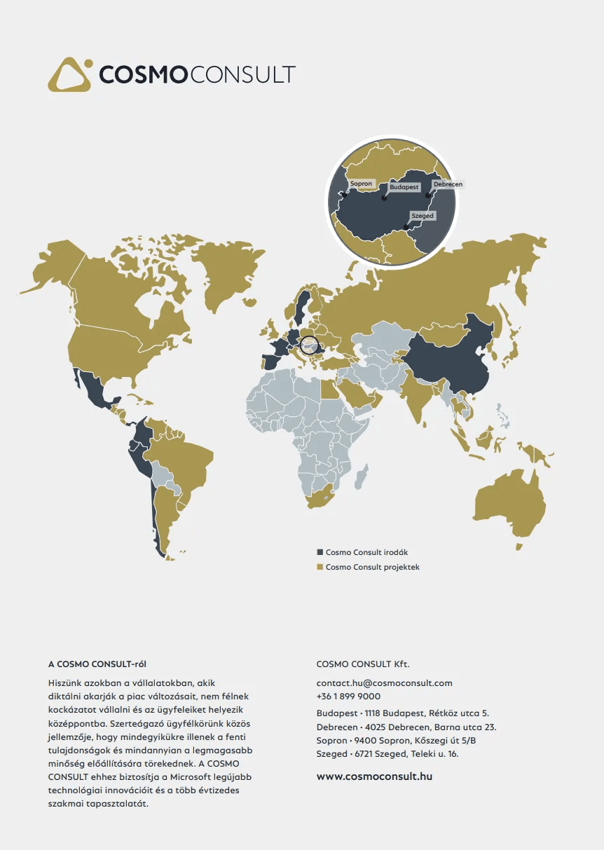 A COSMO CONSULT a világ legnagyobb saját tulajdonosai által irányított Microsoft Dynamics partnere. Ügyfeleinkkel közösen több mint 10.000 sikeres ERP-projektet valósítottunk meg. Sikerünk alapja az elkötelezettség és a hosszú távú partnerség, amely nem ér véget az éles indulással. A MyCOSMO szolgáltatási portálon bármikor segítséget kap, ha kérdése merül fel vagy támogatásra van szüksége!