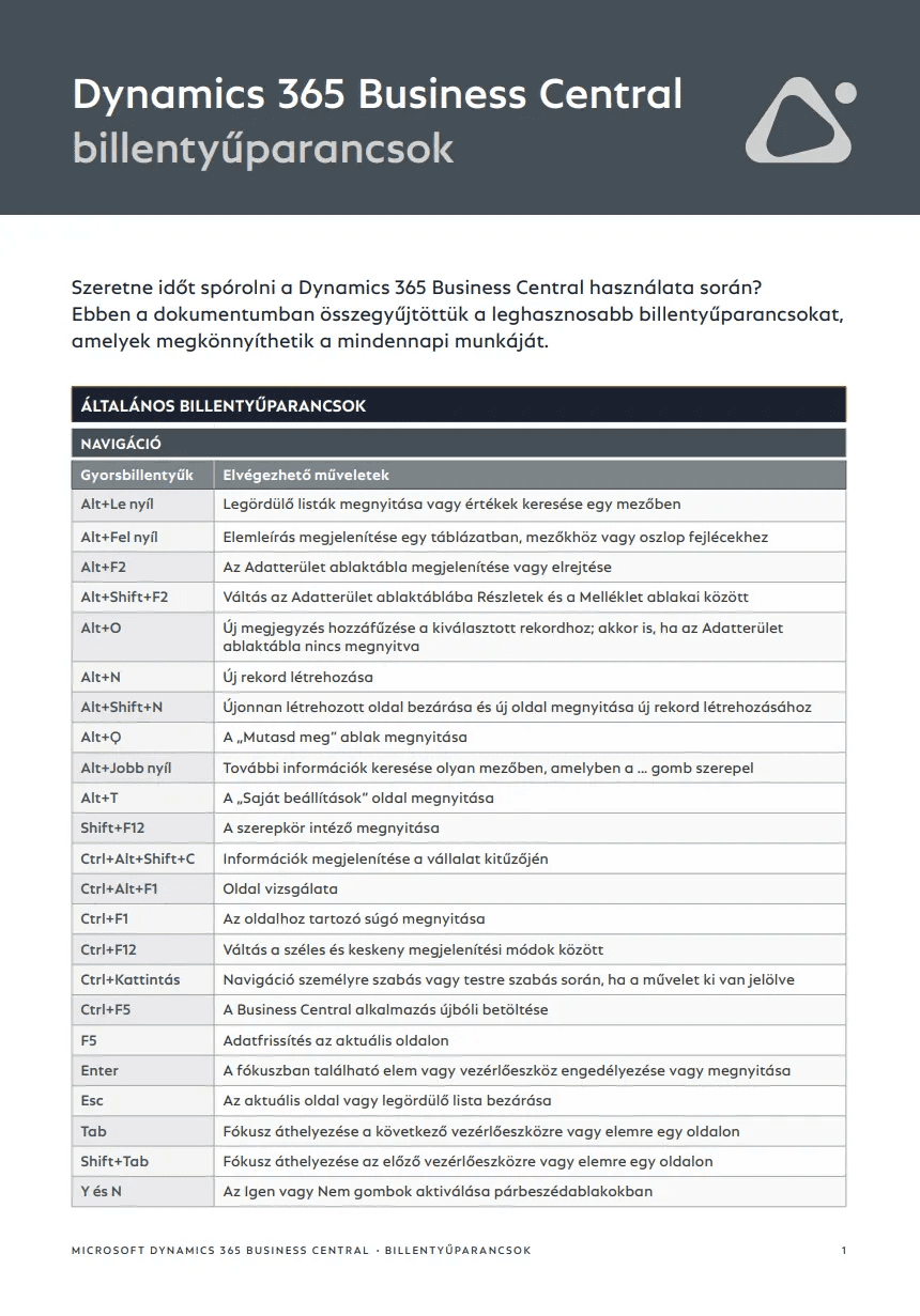 Business Central billentyűparancsok