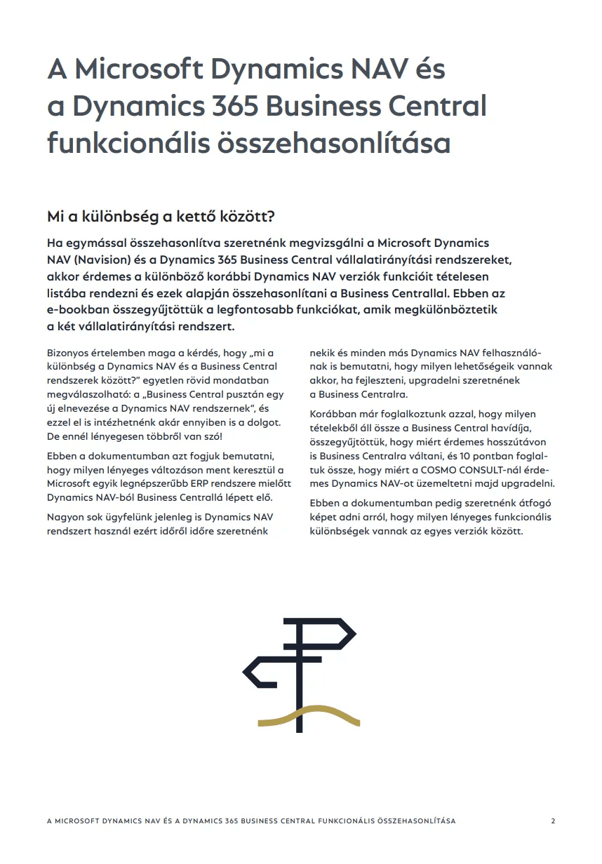 Ha egymással összehasonlítva szeretnénk megvizsgálni a Microsoft Dynamics NAV (Navision) és a Dynamics 365 Business Central vállalatirányítási rendszereket, akkor érdemes a különböző korábbi Dynamics NAV verziók funkcióit tételesen listába rendezni és ezek alapján összehasonlítani a Business Centrallal. Ebben az e-bookban összegyűjtöttük a legfontosabb funkciókat, amik megkülönböztetik a két vállalatirányítási rendszert.