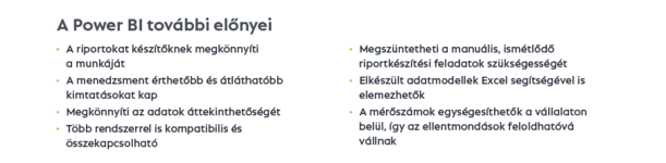 A Power BI egy hatékony eszköz, amely lehetővé teszi a nagy mennyiségű adat gyors és átlátható elemzését, így támogatva a stratégiai döntéshozatalt. Interaktív kimutatások és vizualizációk segítségével a vállalatok könnyebben érthetővé és kezelhetővé tehetik az összetett adathalmazokat, megkönnyítve a piaci változásokra való gyors reagálást.