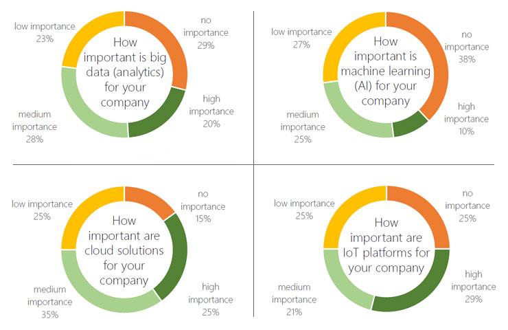 Many of these topics are currently associated with cloud technology, which is still being met with hesitation. The general skepticism about cloud systems is abating. In many cases, however, the infrastructure has not caught up yet. What’s more, practical examples of application are still in short supply. The VDMA IT Report offers some insight into this question, too: The topic of artificial intelligence (AI) or machine learning, for example, is still rated as having little or no importance by a whopping 55% of businesses. The results paint a similar picture for cloud technology, big data and IoT.