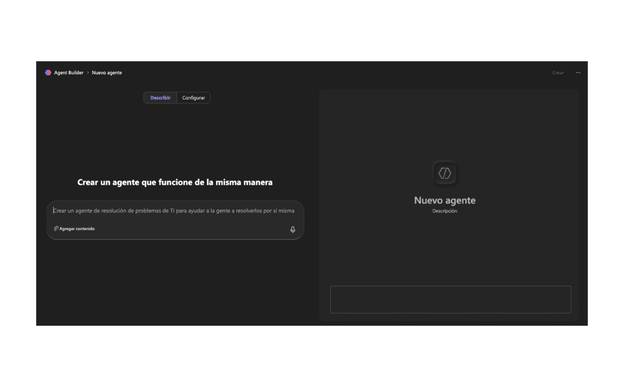 Ahora, la conversación, la interacción en lenguaje natural se ha convertido en la interfaz para crear agentes. Las personas pueden describir lo que necesitan y crear un agente que lo ejecute.