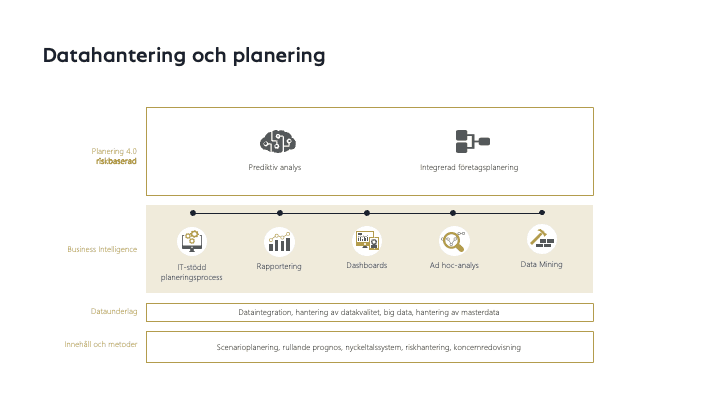 En integrerad planeringslösning kräver därför en nära koppling mellan alla system: allt planeringsrelevant innehåll - såsom pris-, kvantitets-, försäljnings-och kostnadsställeplanering - måste konvergera, oberoende av deras fysiska placering. Alla justeringar av de enskilda delplanerna måste direkt återspeglas i de efterföljande planeringsstegen. Dataunderlaget måste alltid vara fullständigt och av tillräcklig kvalitet, både för klassiska jämförelser mellan mål och utfall och för tillämpning av prediktiv analys.