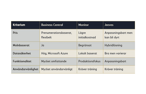 Vi jämför tre populära ERP-lösningar: Business Central, Monitor och Jeeves.