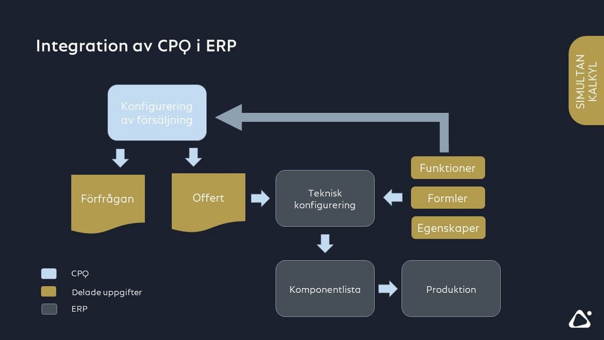 Lösningen är en struktur där CPQ-systemet är helt integrerat i ERP-systemet och båda systemen använder samma databas. Alla konfigurationsregler underhålls och hanteras i ERP-systemet.