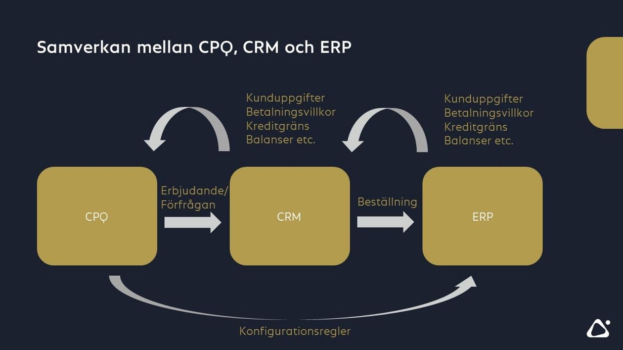 Försäljningsavdelningen, återförsäljare och kunder använder en attraktiv grafisk konfigurator - helst med 3D-visualisering - och vid behov en integrerad kundportal. De skapade förfrågningarna eller erbjudandena överförs till ERP-systemet. Om en beställning görs kan en teknisk konfiguration göras utifrån den konfiguration som skapats i CPQ-systemet och som ligger till grund för produktionsorderna. CPQ-systemet hänvisar direkt till de masterdata och konfigurationsregler som har lagts in i ERP-systemet. Som ett resultat av detta minskas den mängd data som användaren behöver skriva in och processens tillförlitlighet ökar.