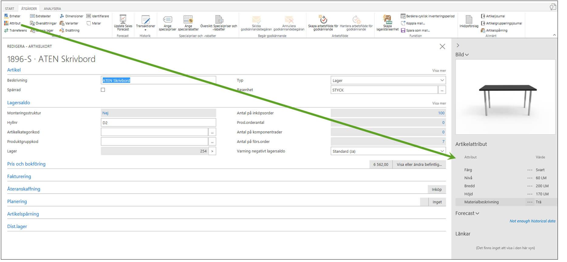 - Till Artiklar kan vi ny knyta Attribut, Man behöver inte längre anpassa artikelregistret med nya fält, utan kan enkelt definiera ett attribut och knyta till artikeln. Attributen blir synliga i faktaboxen till Artikeln, och det går också att filtrera artiklar på dess attribut.