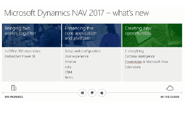 I allmänhet utgör de nya och förbättrade funktionerna i Microsoft Dynamics NAV 2017 enligt tre områden: förbättring av kärnfunktioner, närmare samband med mobila lösningar med Office och användarvänliga anpassningar till individuella behov. Dessutom har de grundläggande CRM-funktionerna i Microsoft Dynamics NAV reviderats, tillsammans med möjligheten att enkelt integrera Microsoft Dynamics CRM med hjälp av en ny stödinstallationsguide.